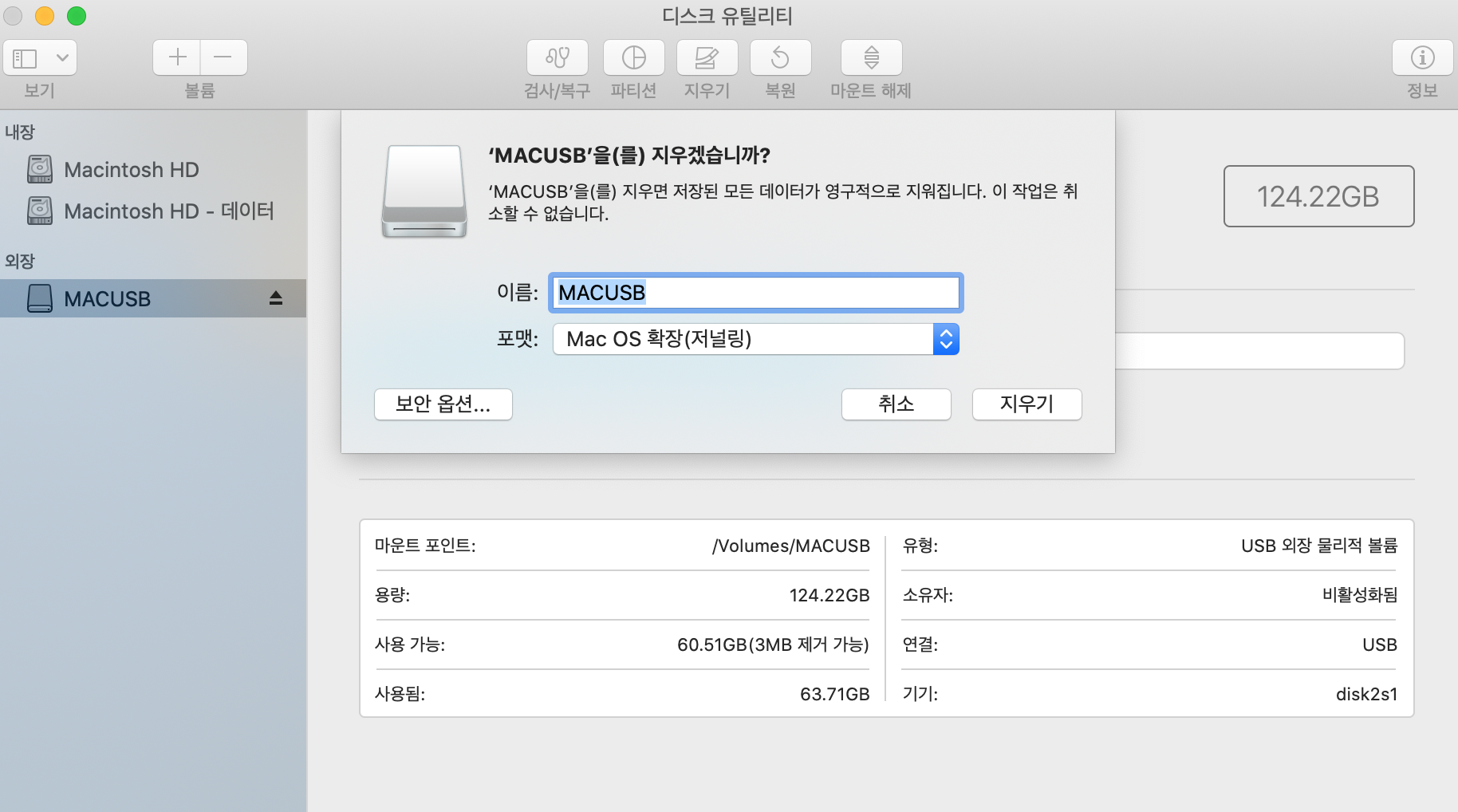 맥은 지우기 버튼을 누르면 포맷이 가능합니다.