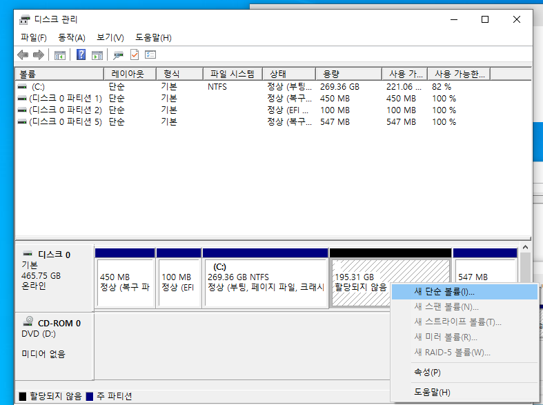잠시 기다리면 c: 옆 공간에 대략 195기가 정도의 새 파티션이 생성 되었습니다.