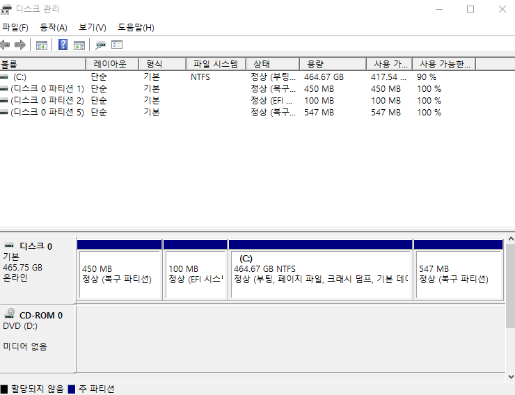 위 캡쳐 화면 처럼 따라 하셨다면 디스크 관리 창이 나올겁니다.