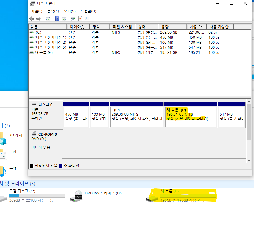 내컴퓨터 실행 하면 새로운 E 드라이브가 생건된 걸 확인 할 수 있어요.